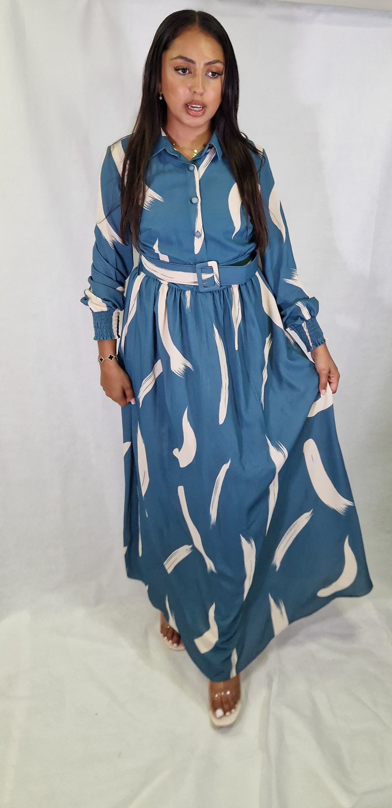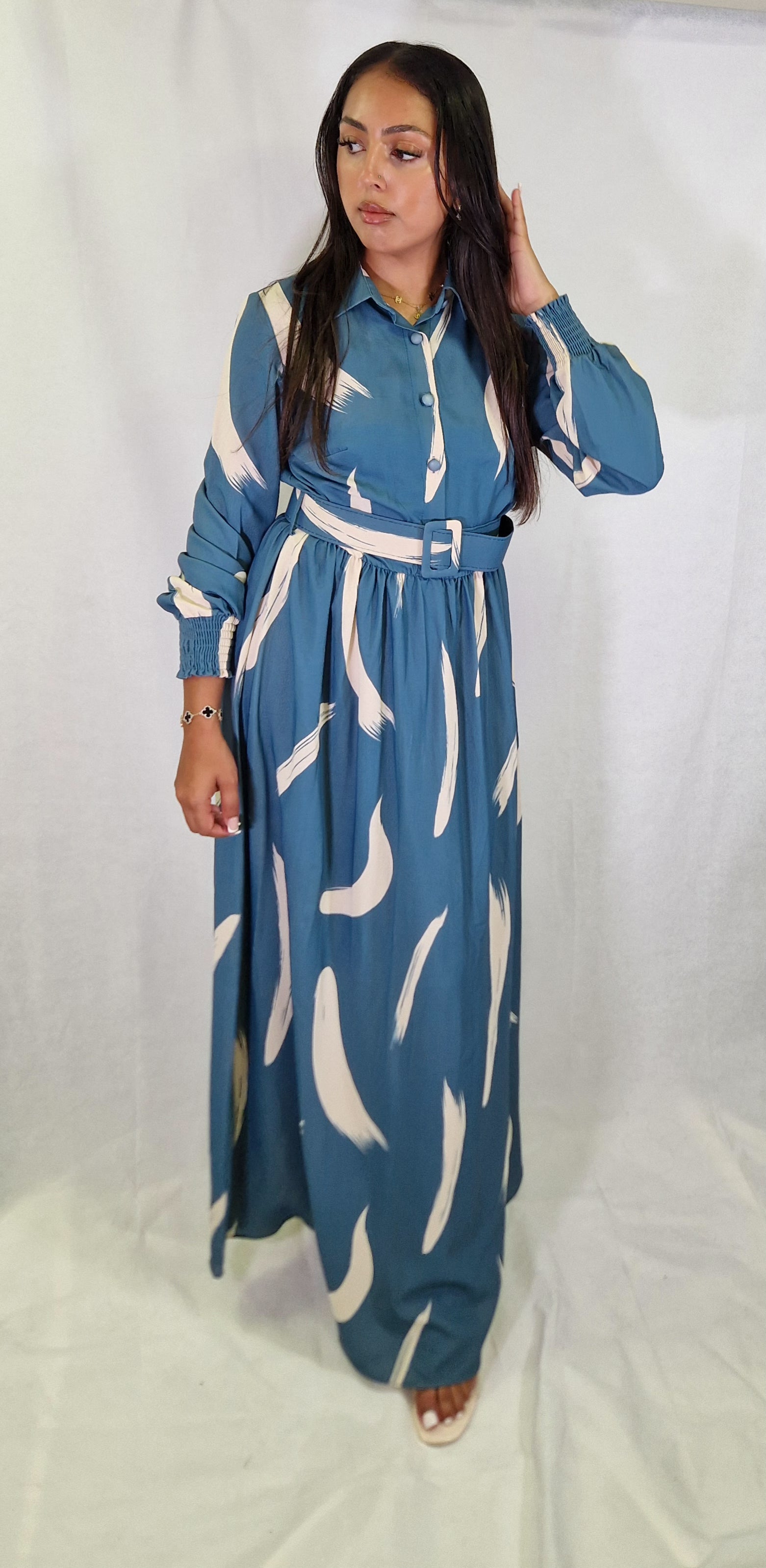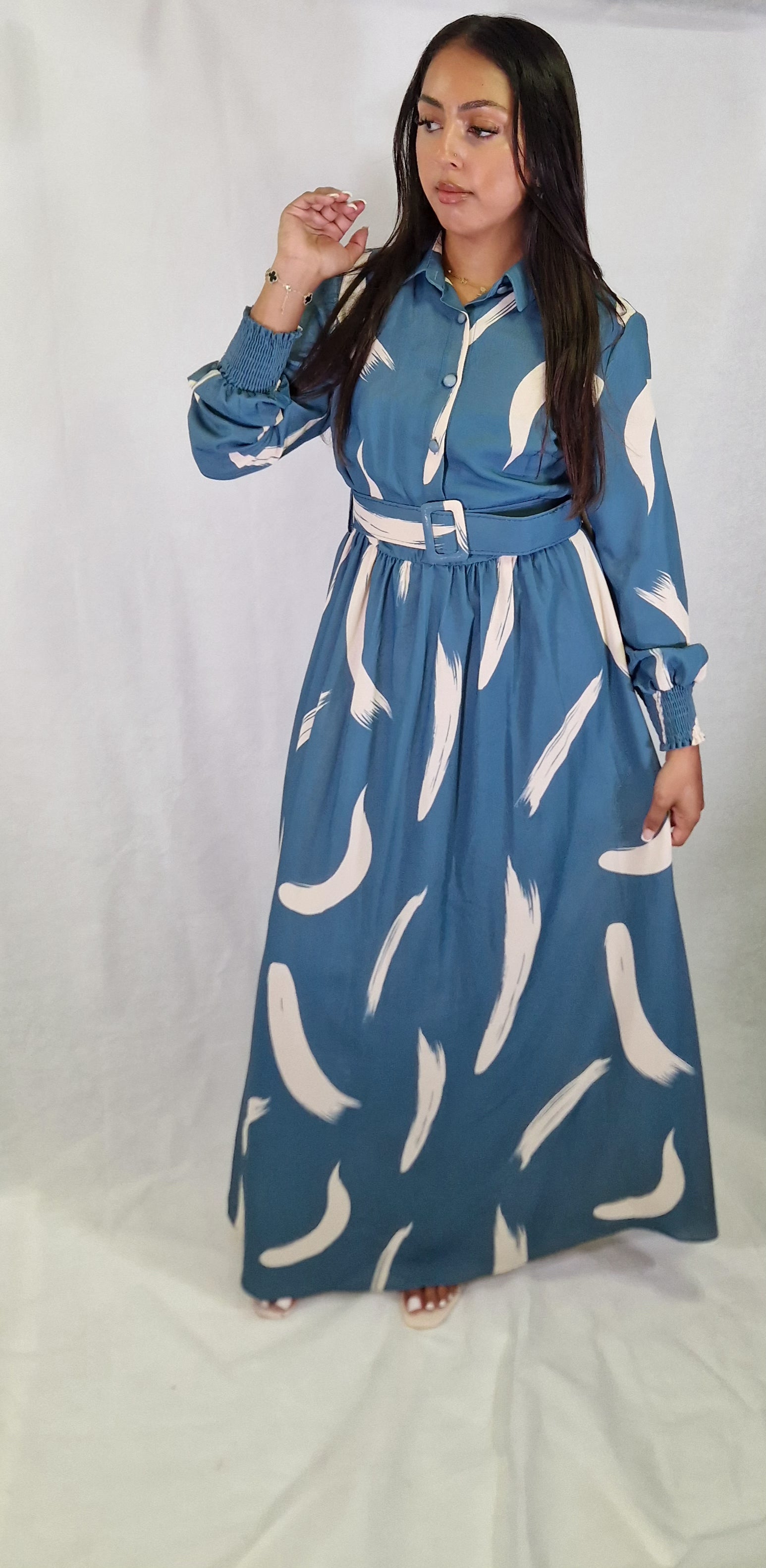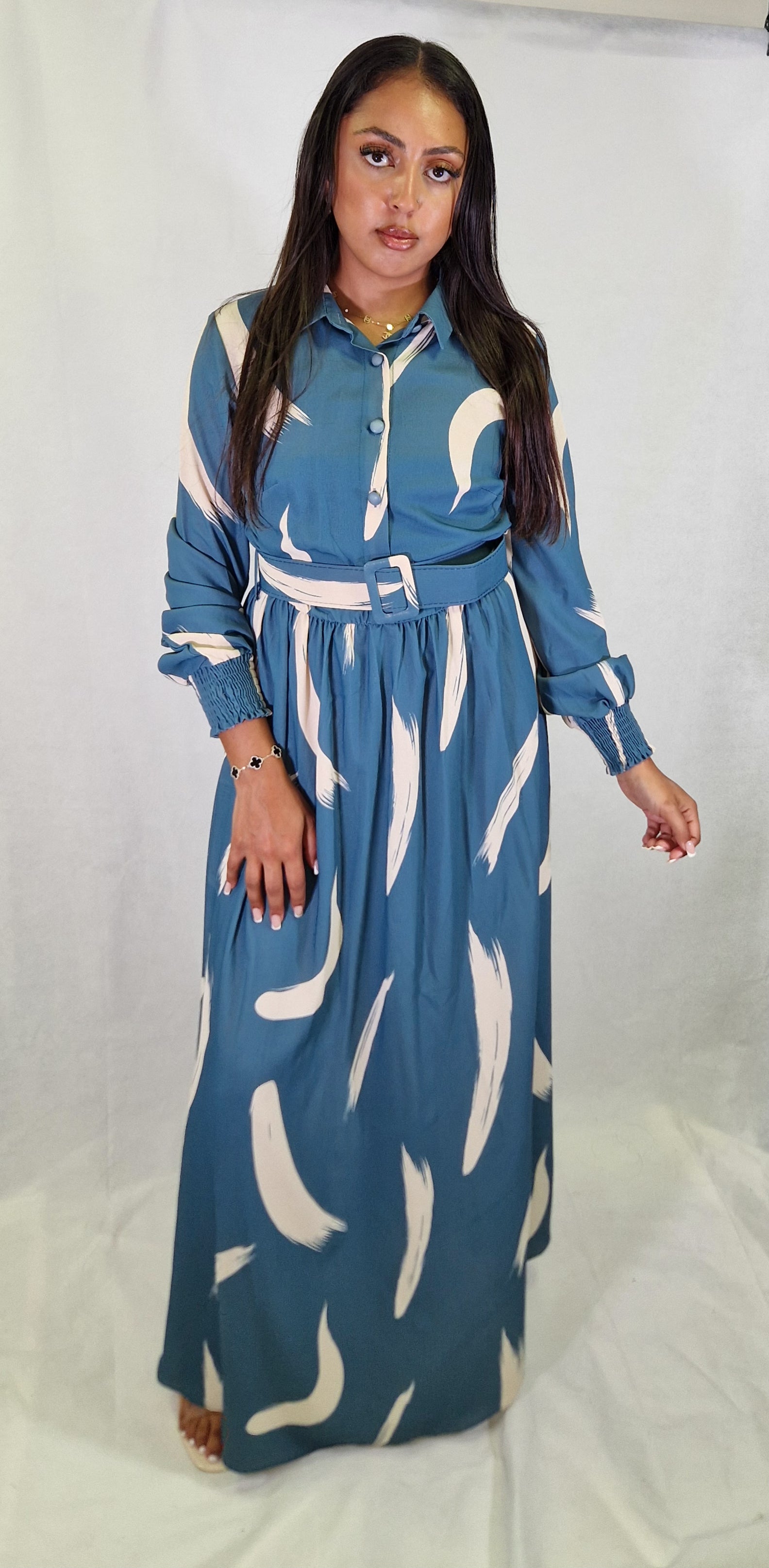 The Atef Abaya features a beautiful print and a thick waist belt that creates a sleek silhouette. Its flowy umbrella cut combined with cuffed sleeves offers a smart and elegant appearance, perfect for making a graceful statement wherever you go.