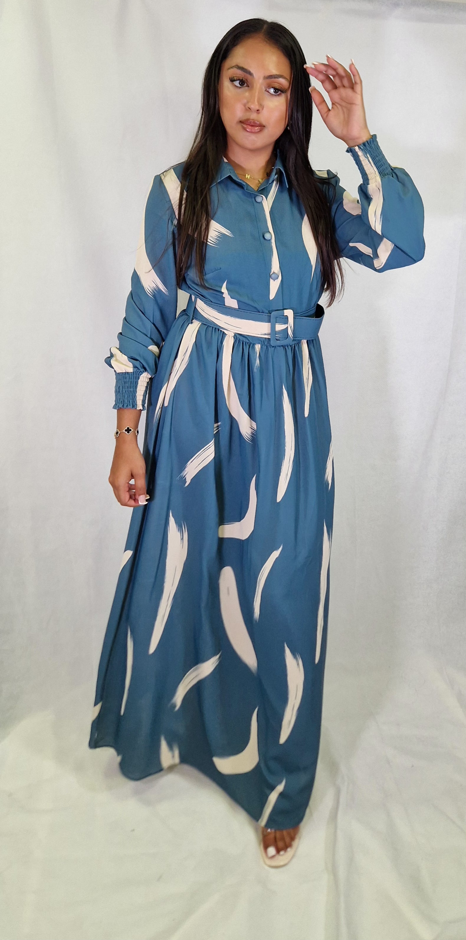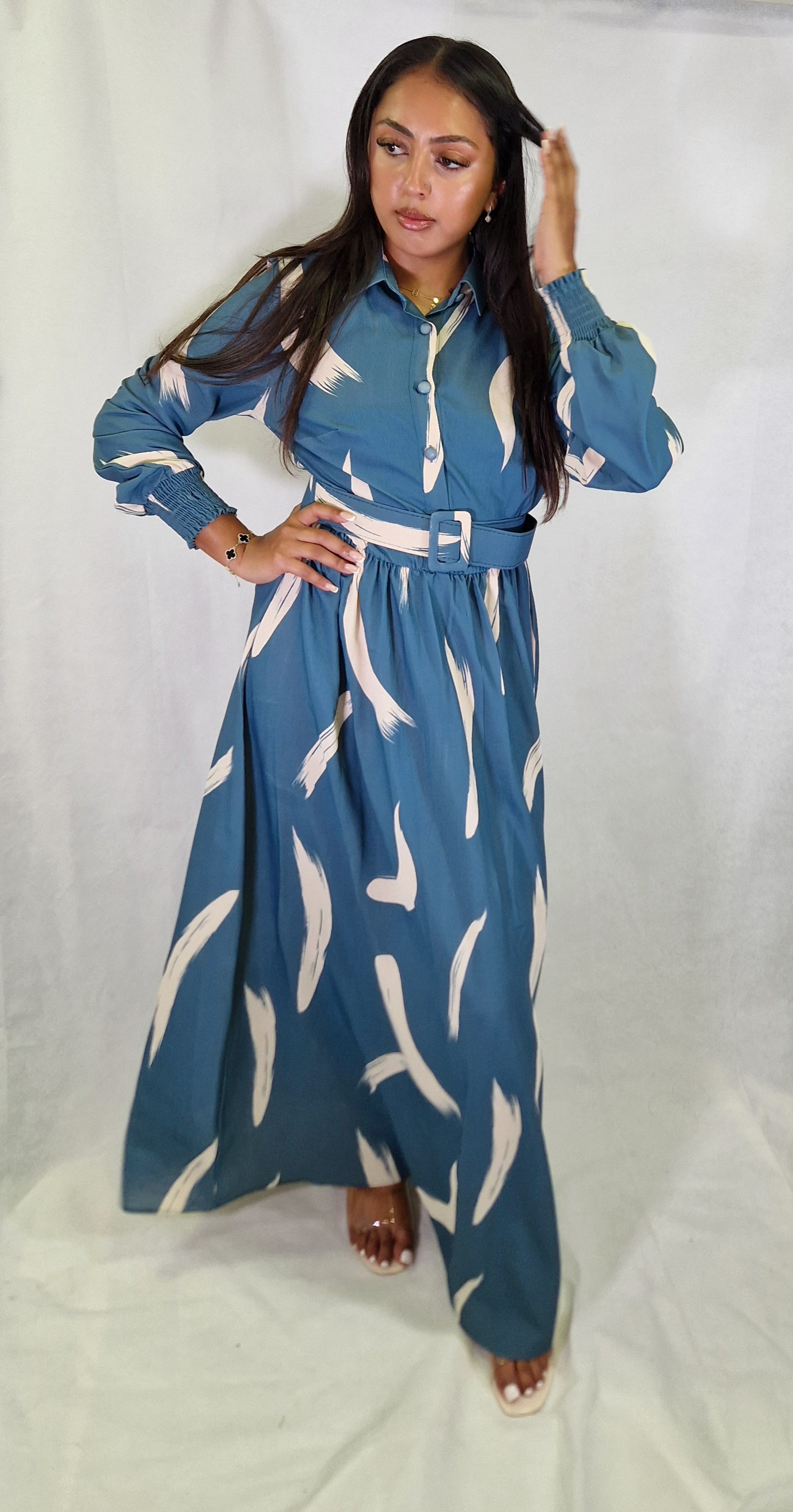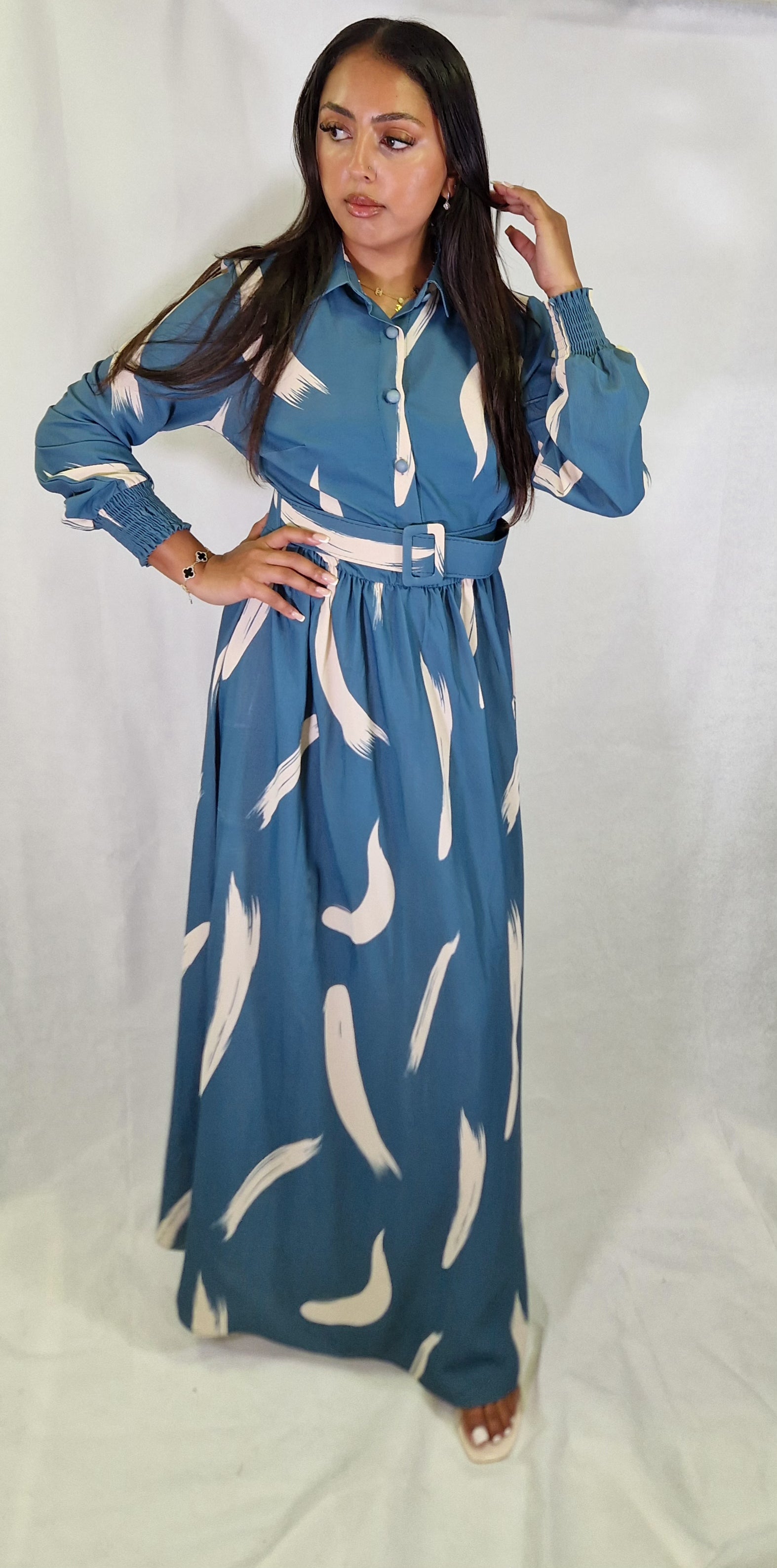 The Atef Abaya features a beautiful print and a thick waist belt that creates a sleek silhouette. Its flowy umbrella cut combined with cuffed sleeves offers a smart and elegant appearance, perfect for making a graceful statement wherever you go.