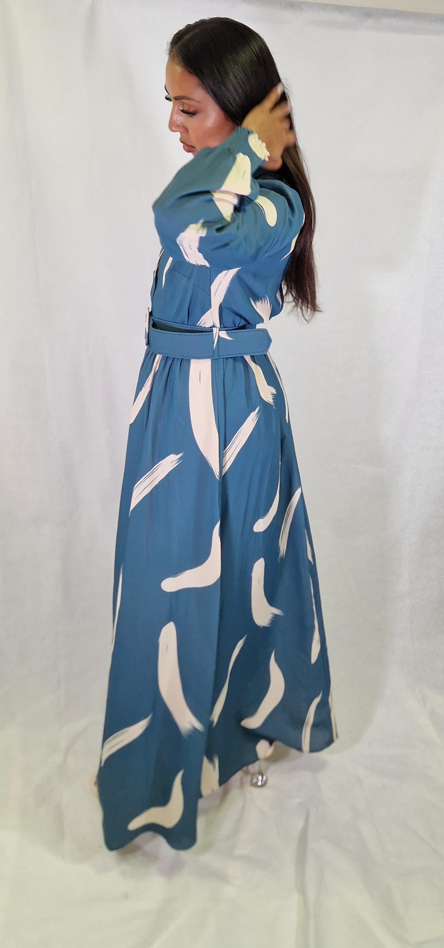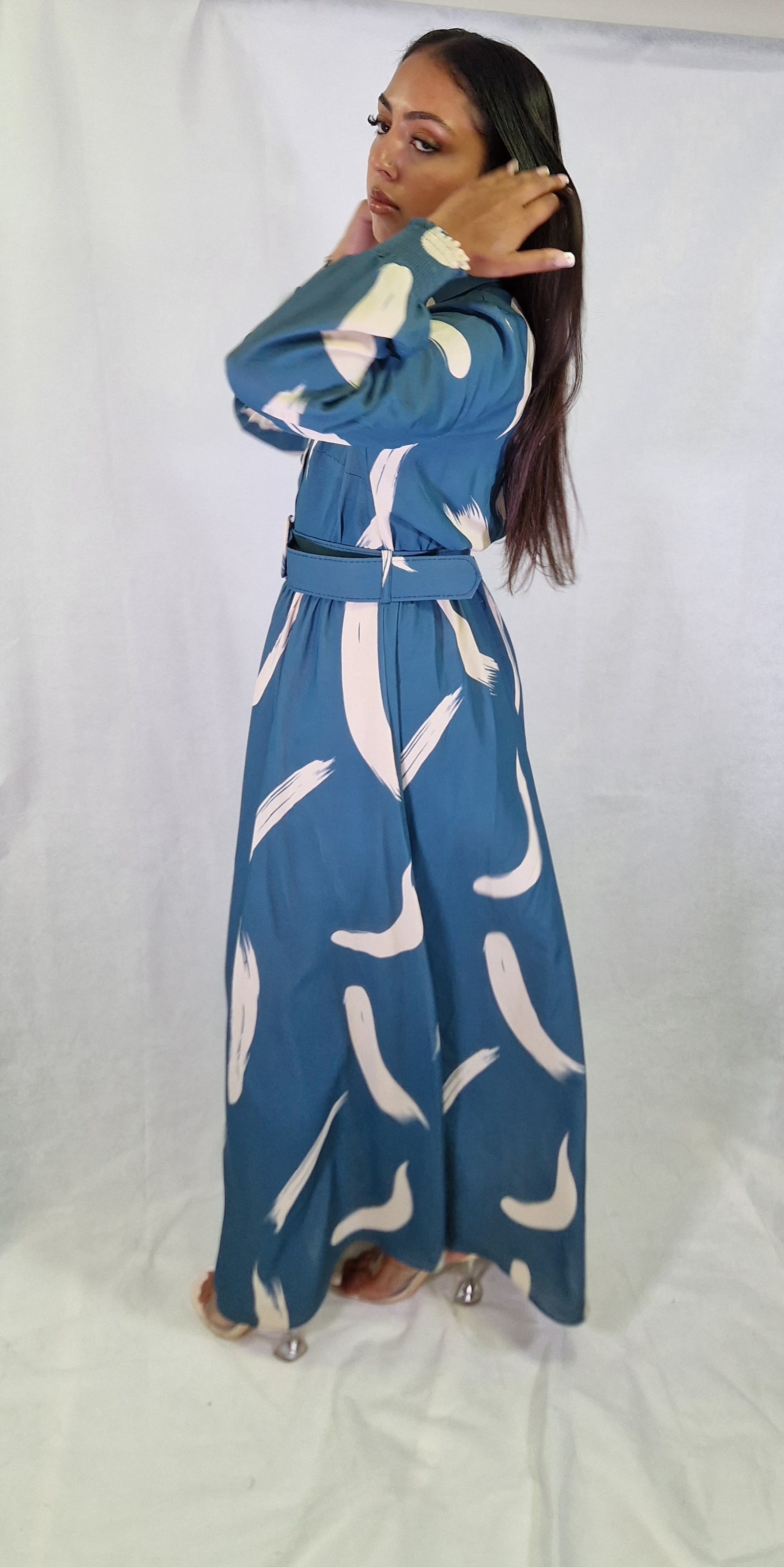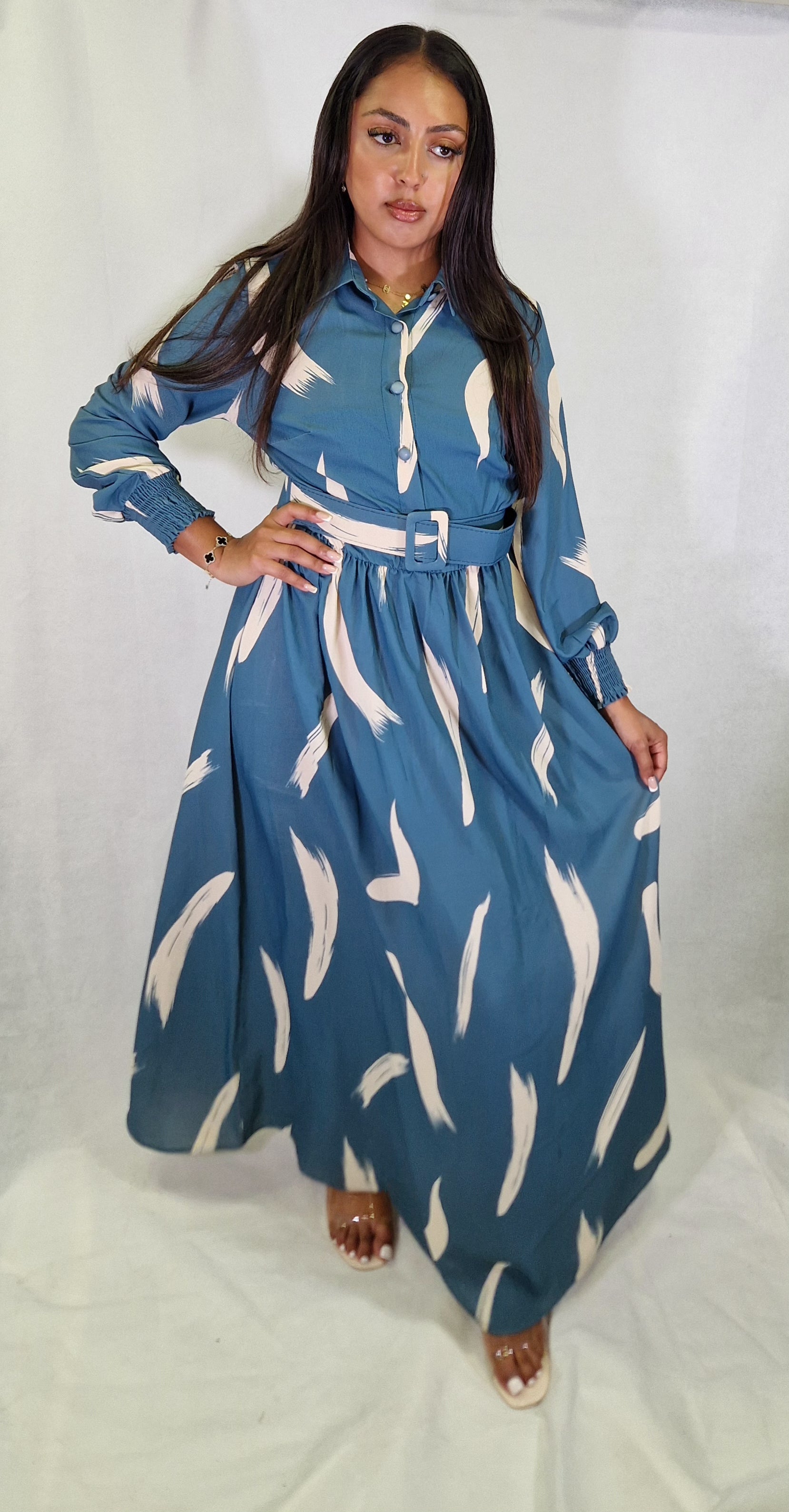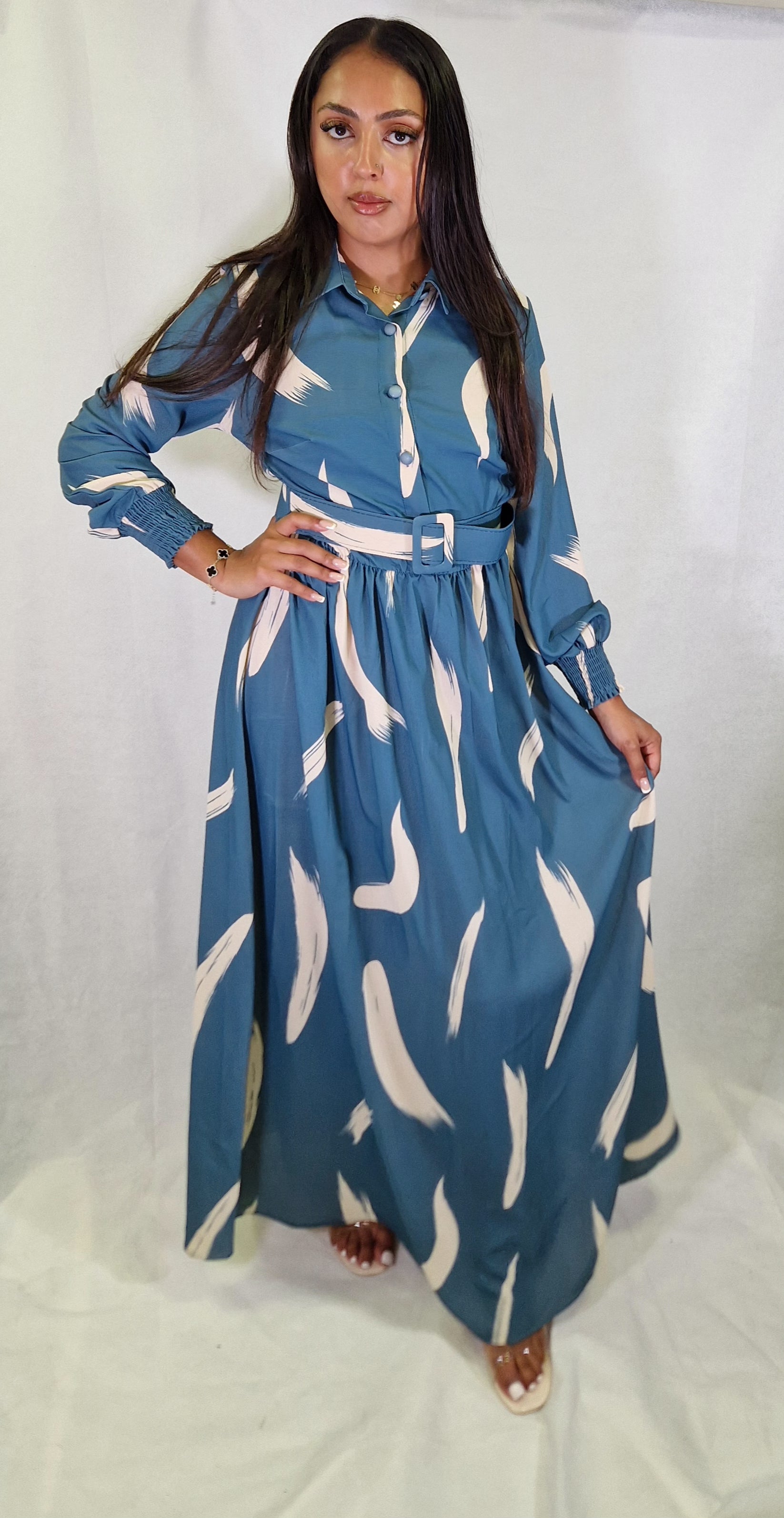 The Atef Abaya features a beautiful print and a thick waist belt that creates a sleek silhouette. Its flowy umbrella cut combined with cuffed sleeves offers a smart and elegant appearance, perfect for making a graceful statement wherever you go.
