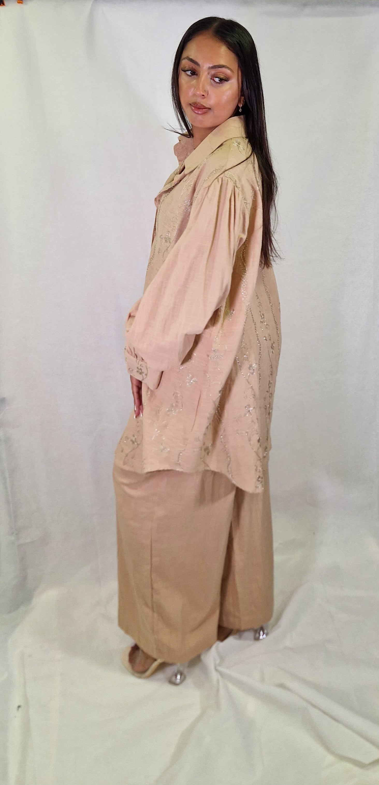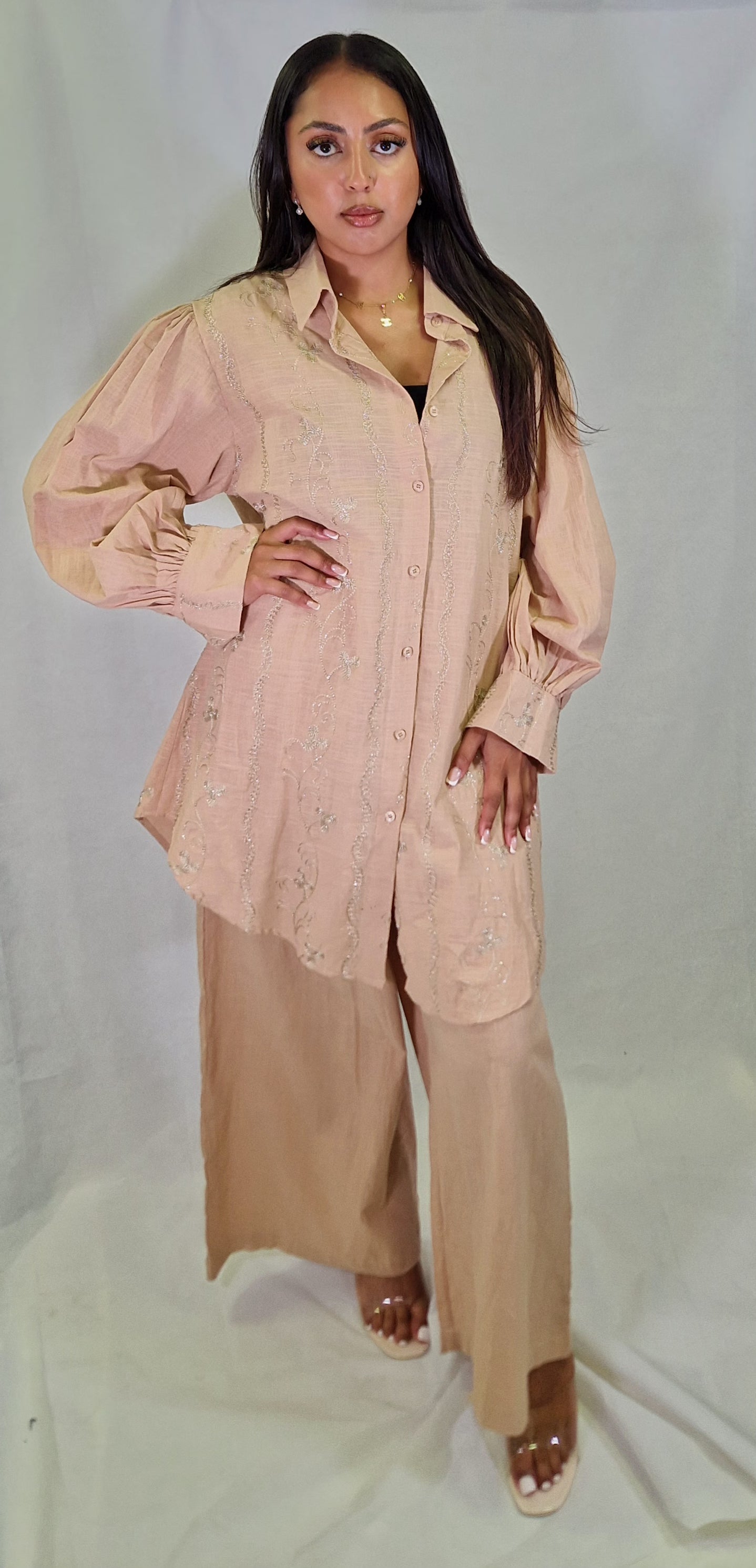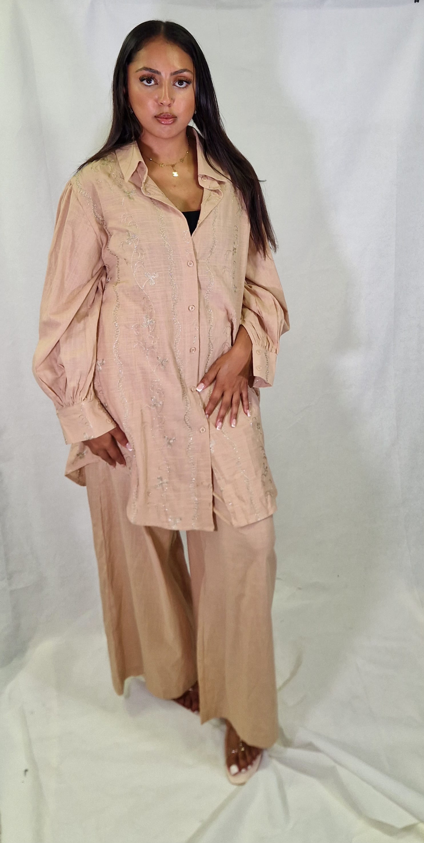Experience ultimate comfort with the Emira suit, featuring a pure cotton oversized shirt and wide-leg trousers ideal for hot weather. The subtle gold embroidery adds an elegant touch, making it perfect for casual outings, evening events, or holiday wear. Stay stylish and comfortable wherever you go.