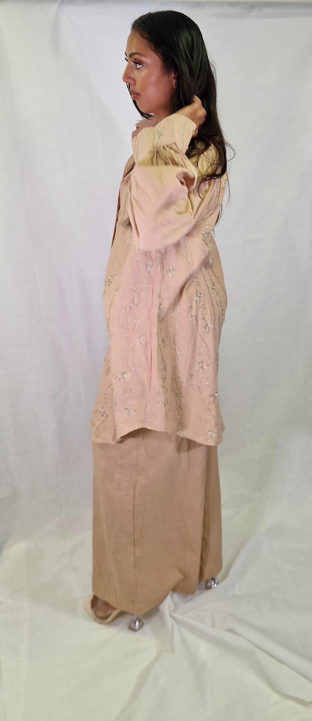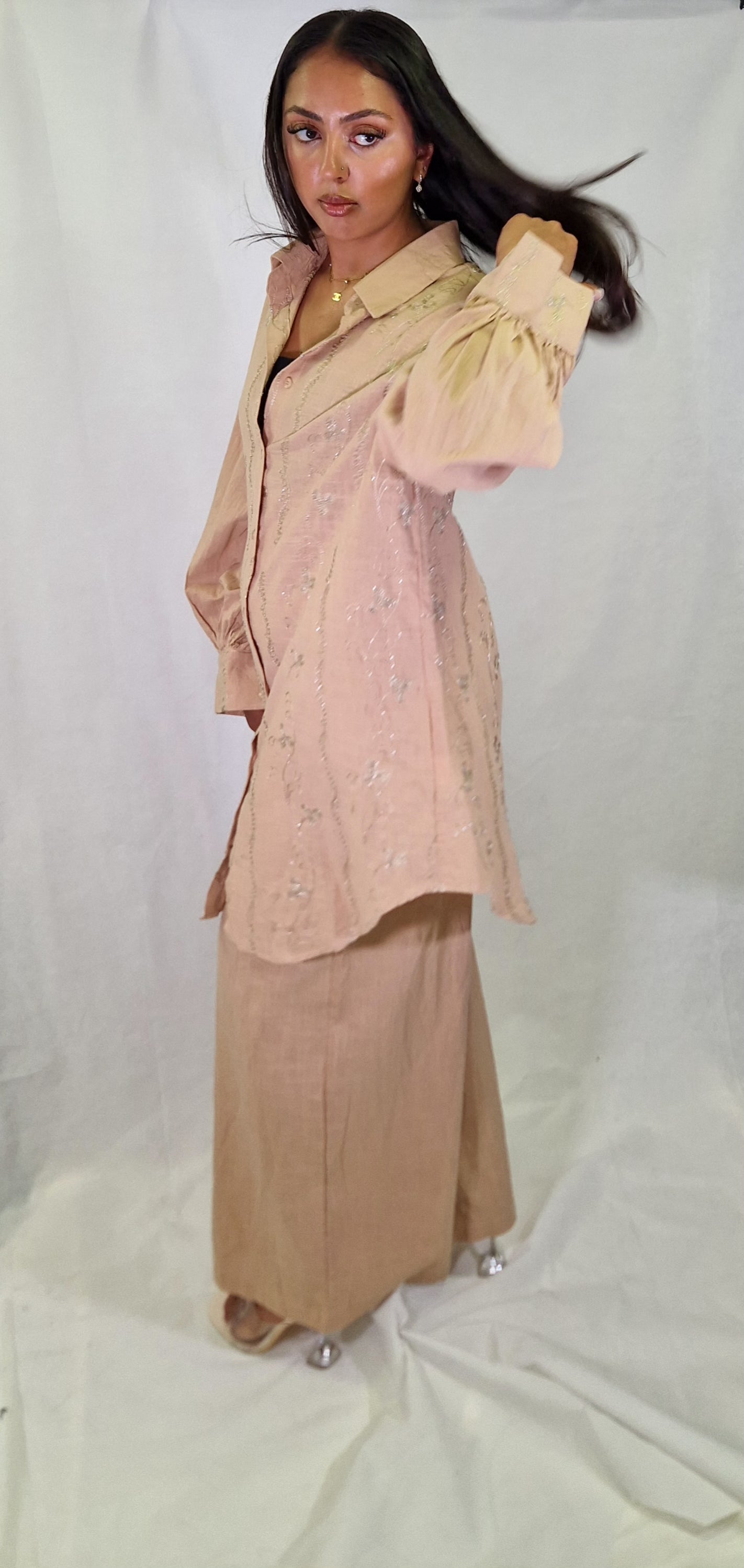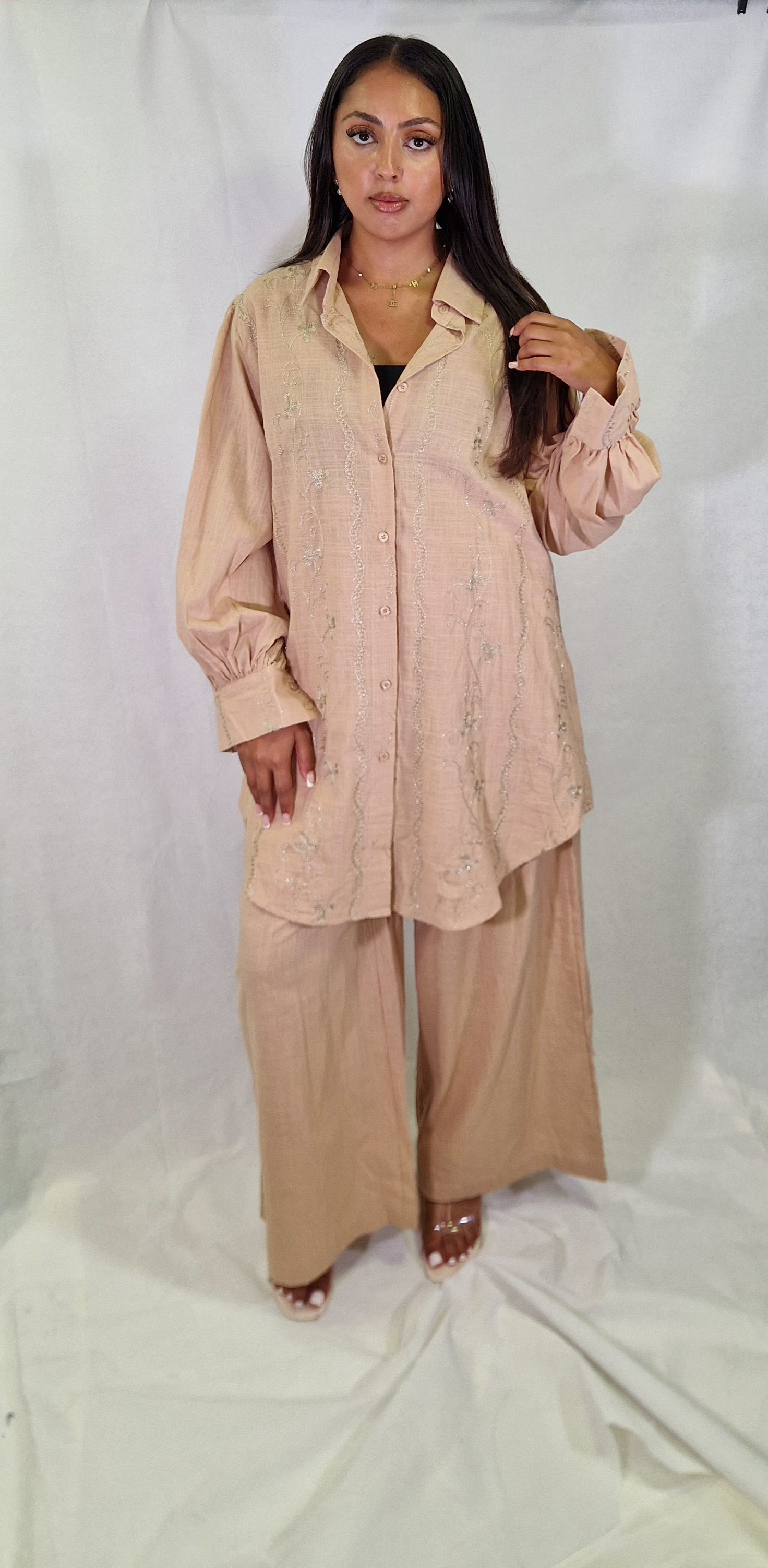 Experience ultimate comfort with the Emira suit, featuring a pure cotton oversized shirt and wide-leg trousers ideal for hot weather. The subtle gold embroidery adds an elegant touch, making it perfect for casual outings, evening events, or holiday wear. Stay stylish and comfortable wherever you go.