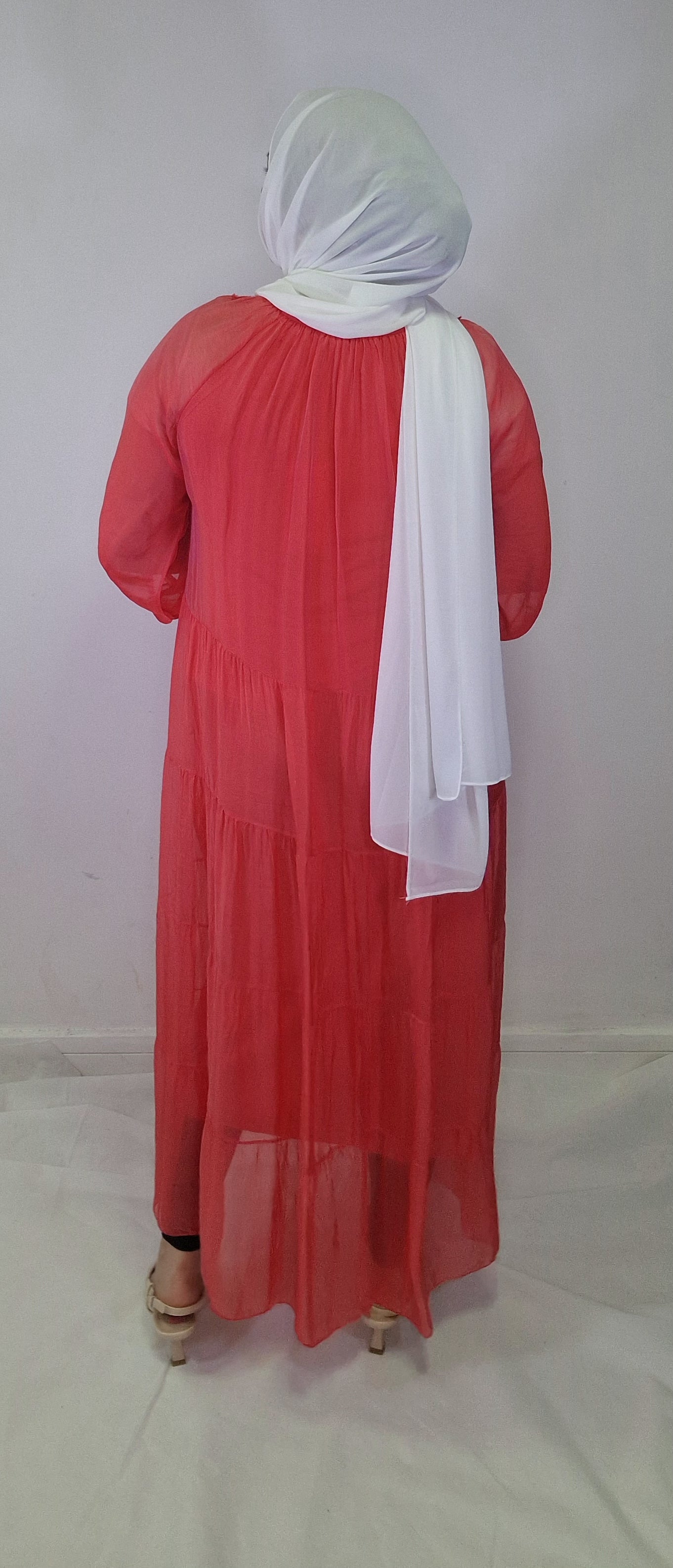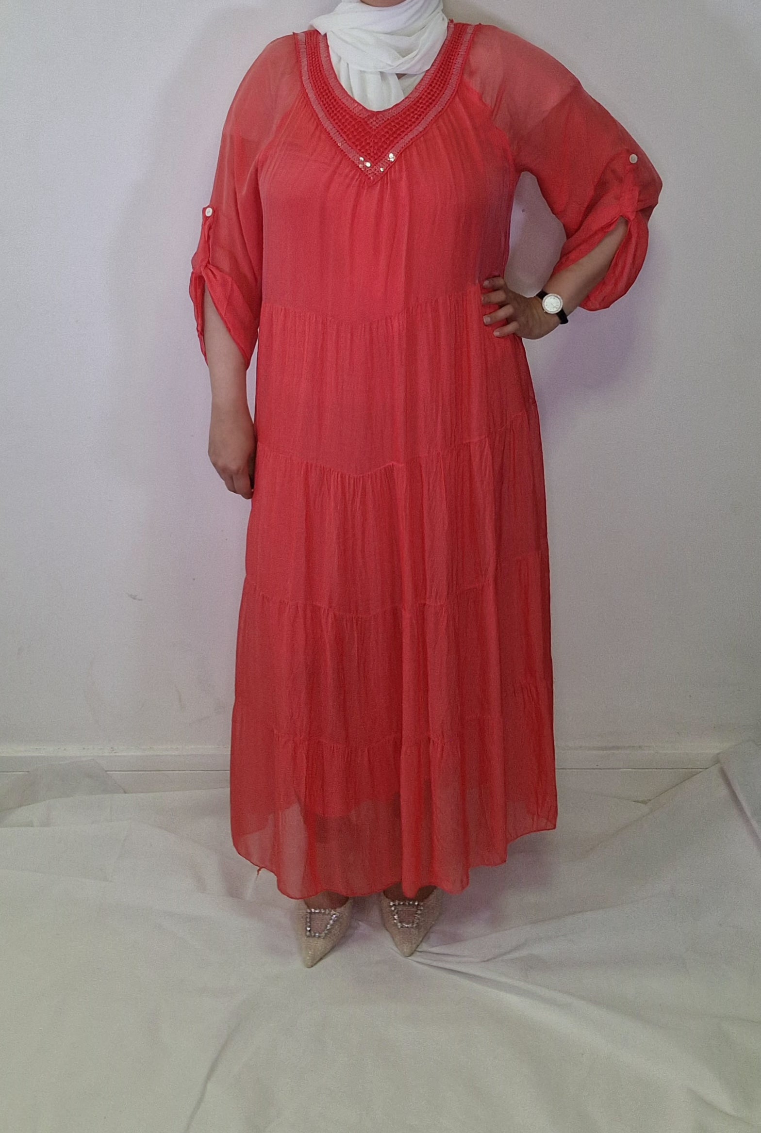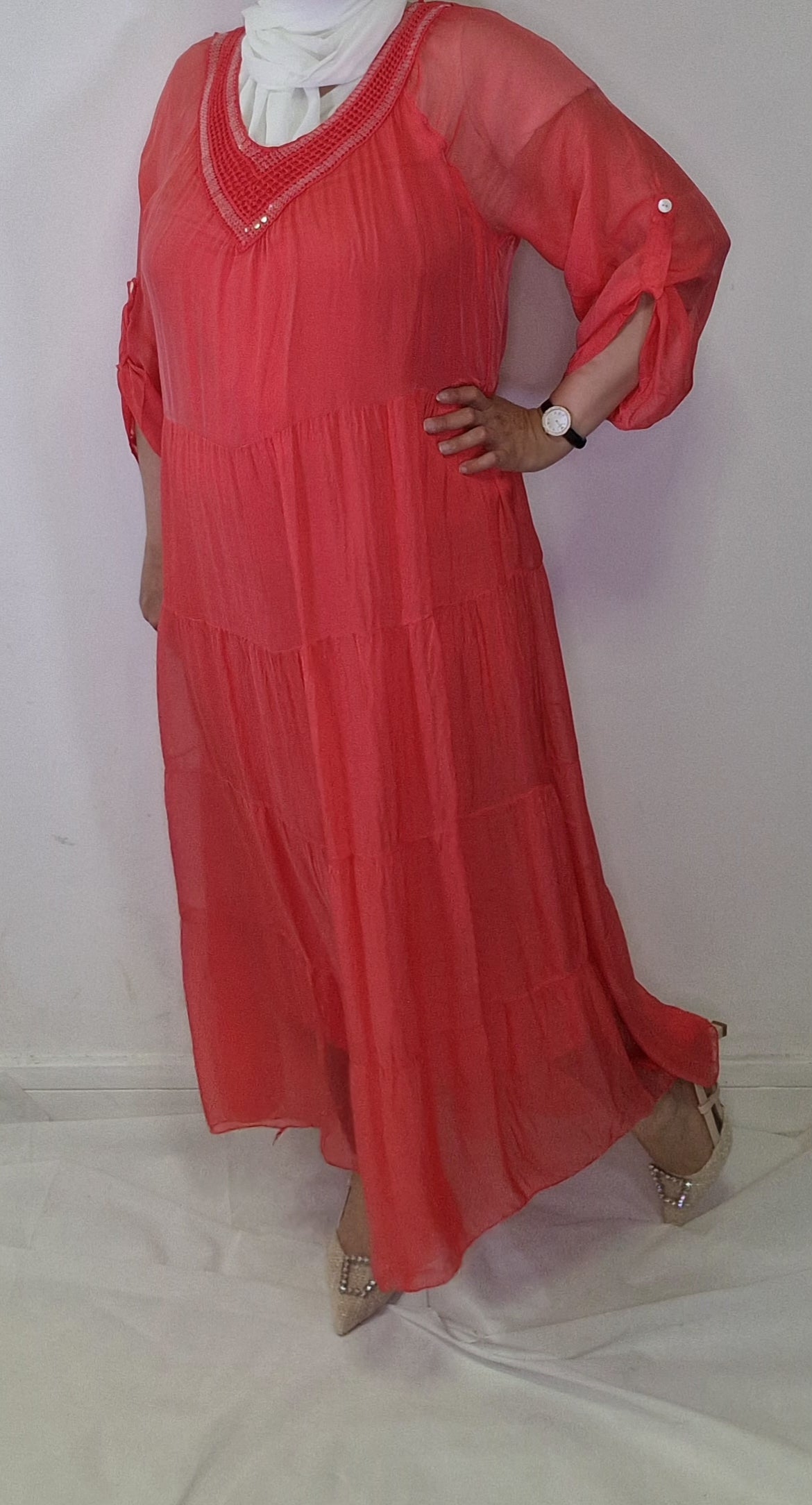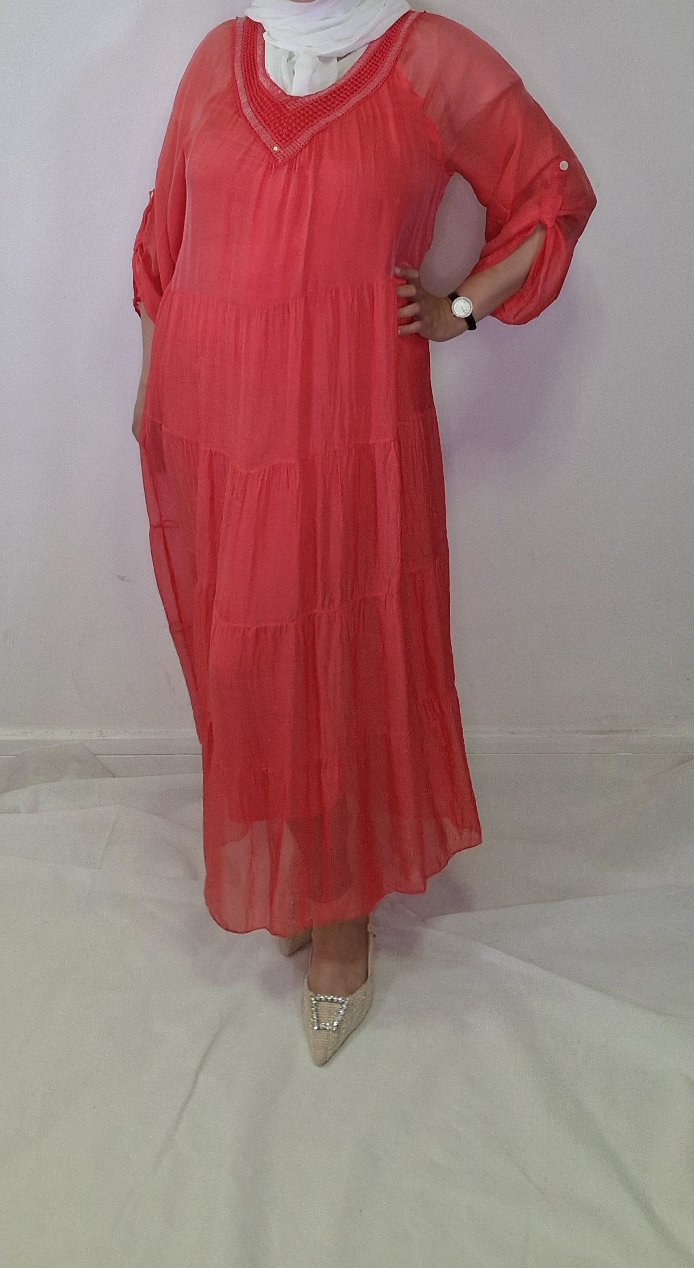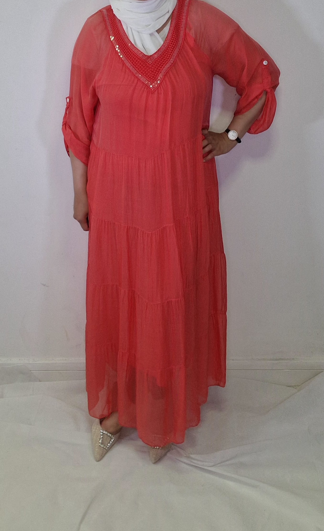 Indulge in the luxurious and elegant Hani silk dress. With its intricately embedded work on the v neck, this dress will make you look and feel classy for any occasion. Elevate your style and turn heads with Hani!