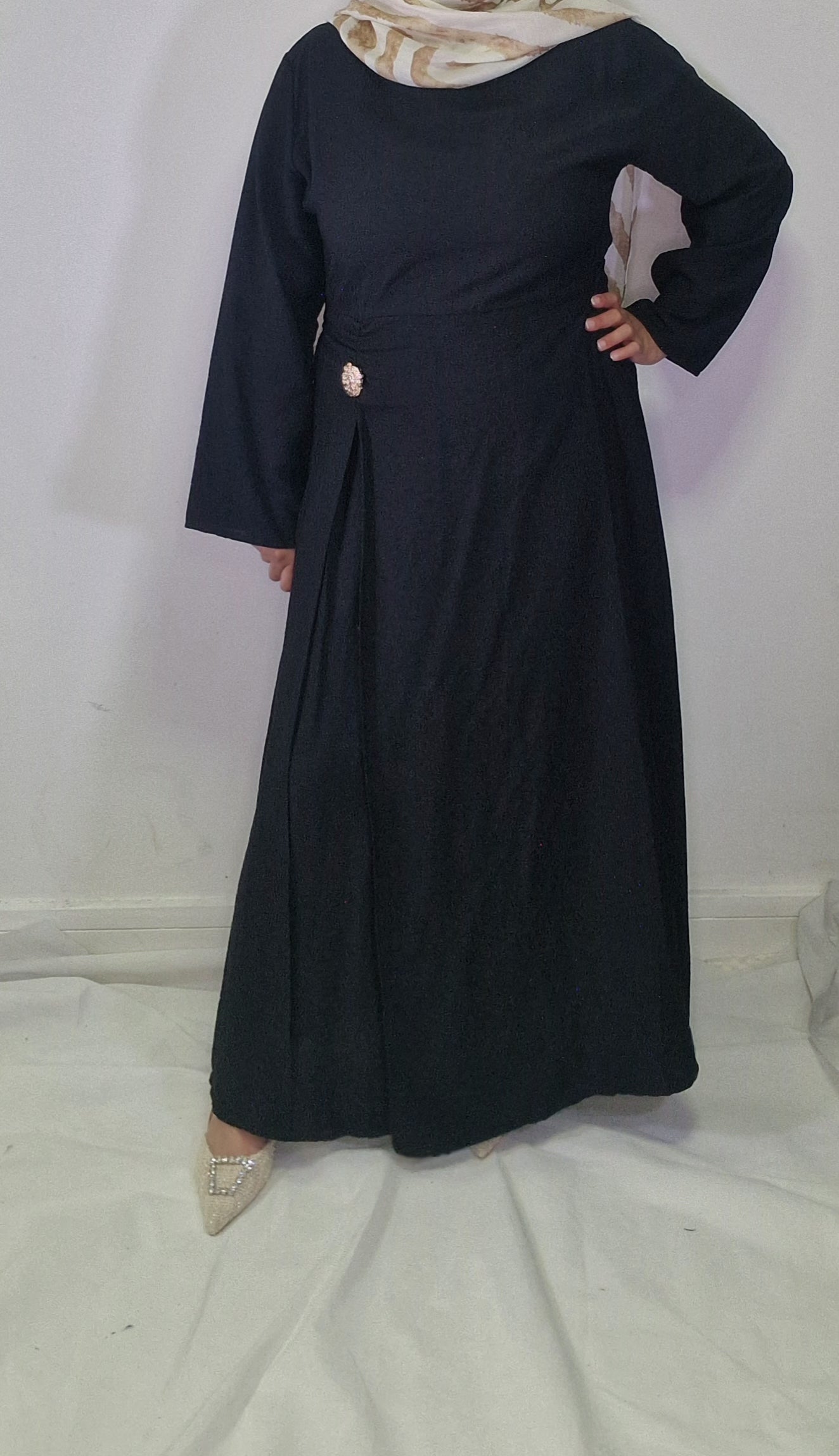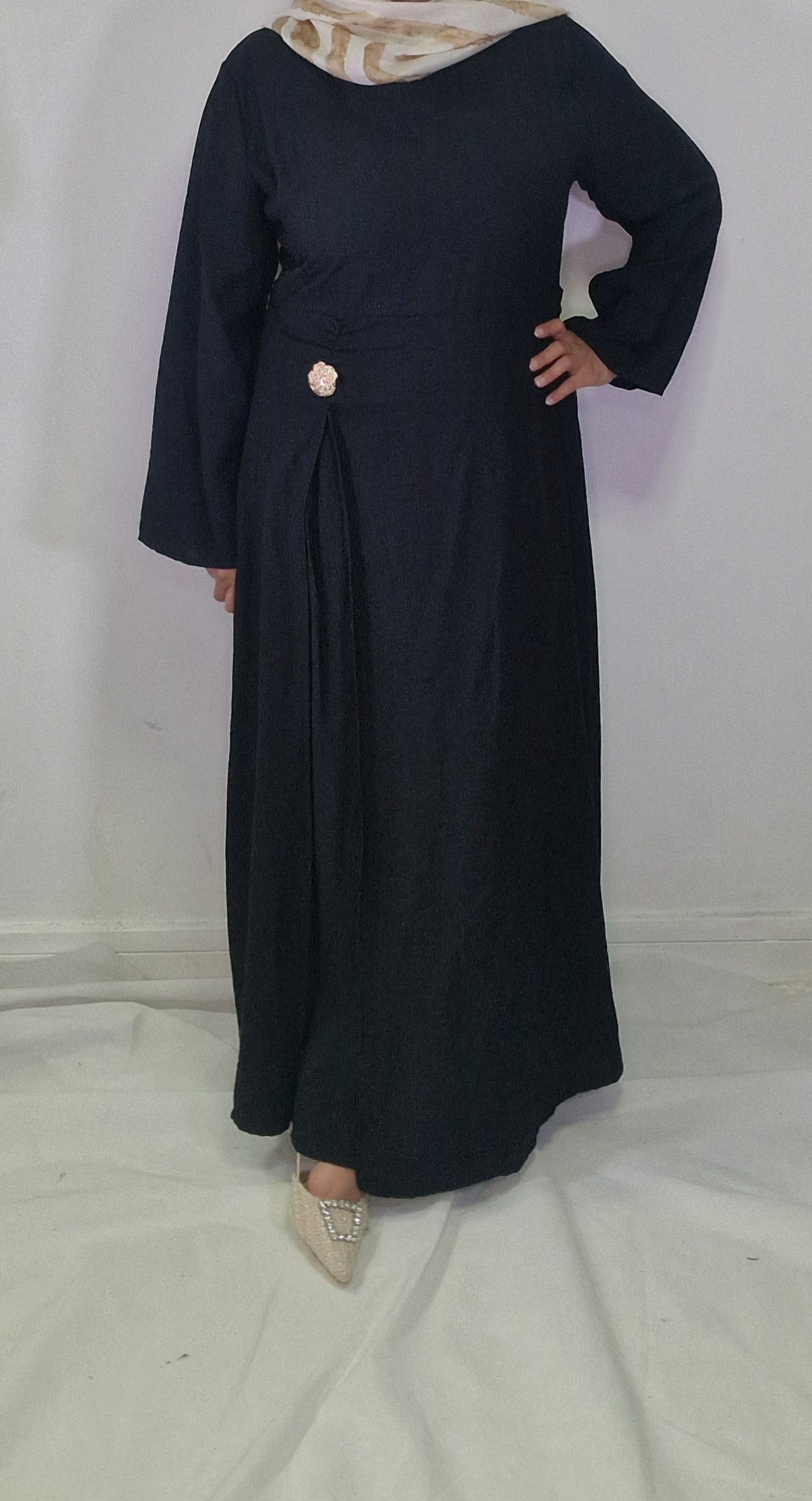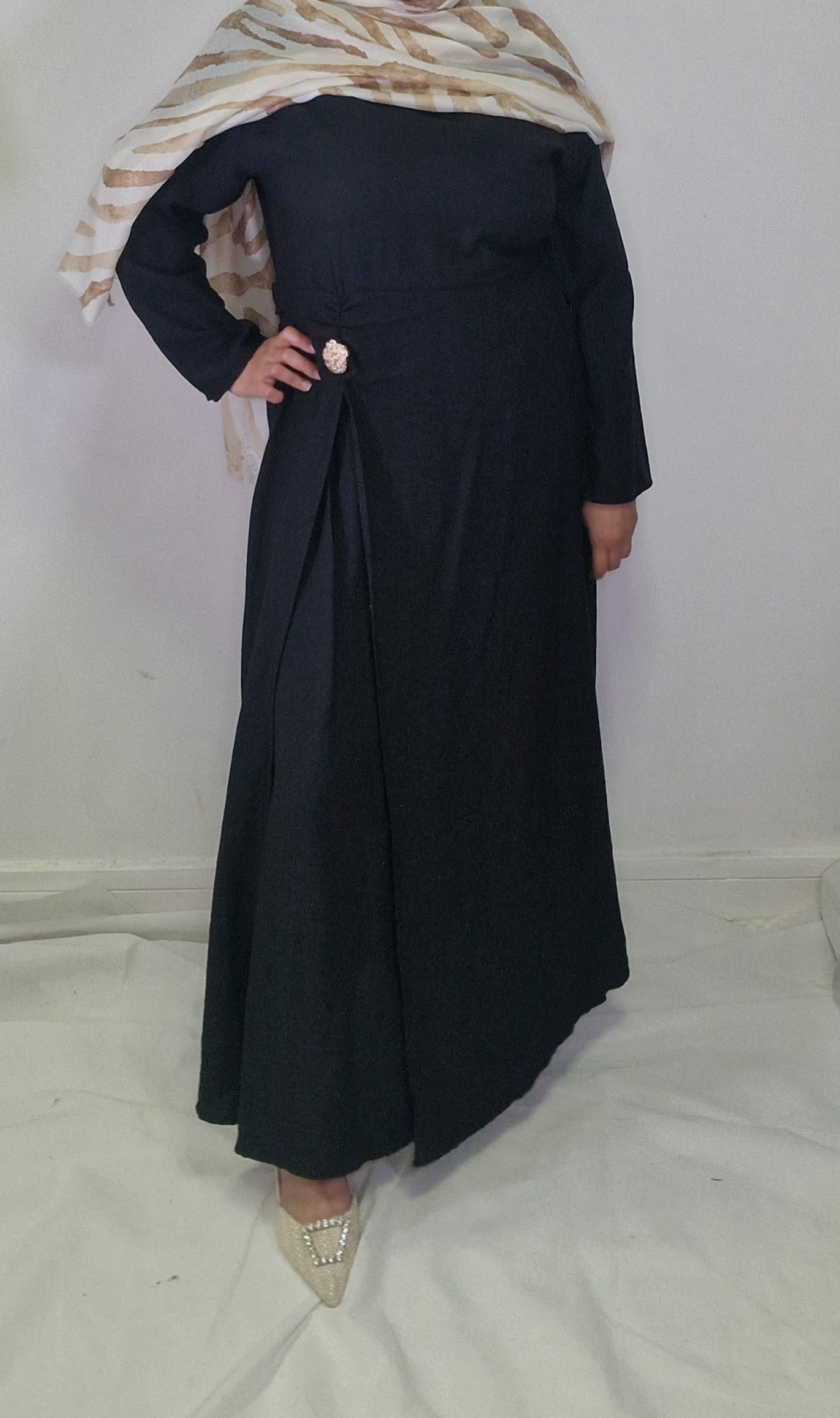 Introducing our Maha abaya, an elegant and chic must-have piece for any wardrobe. With its gold button detail on the waist and open slit, this abaya exudes sophistication and exclusivity. Elevate your modesty and fashion game with this beautiful piece.