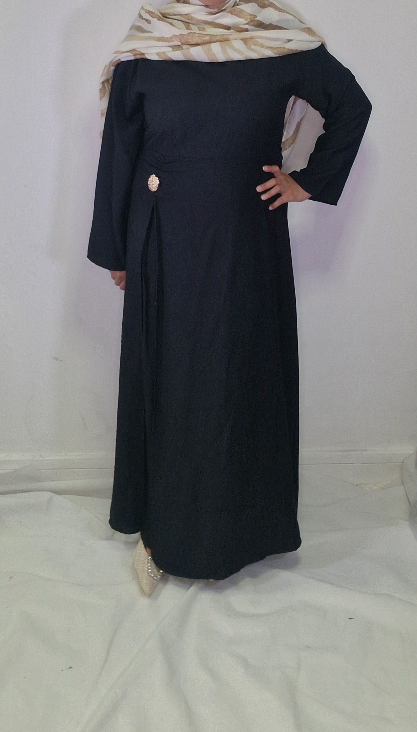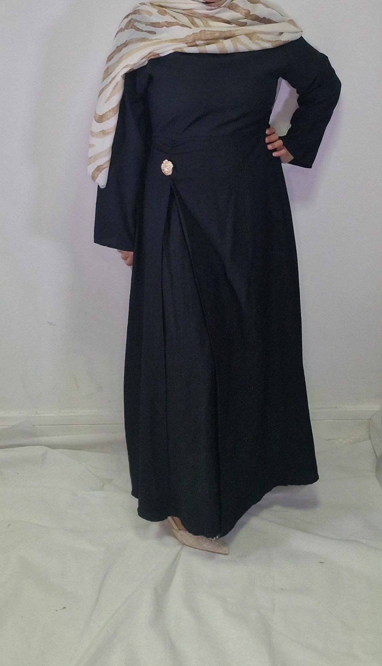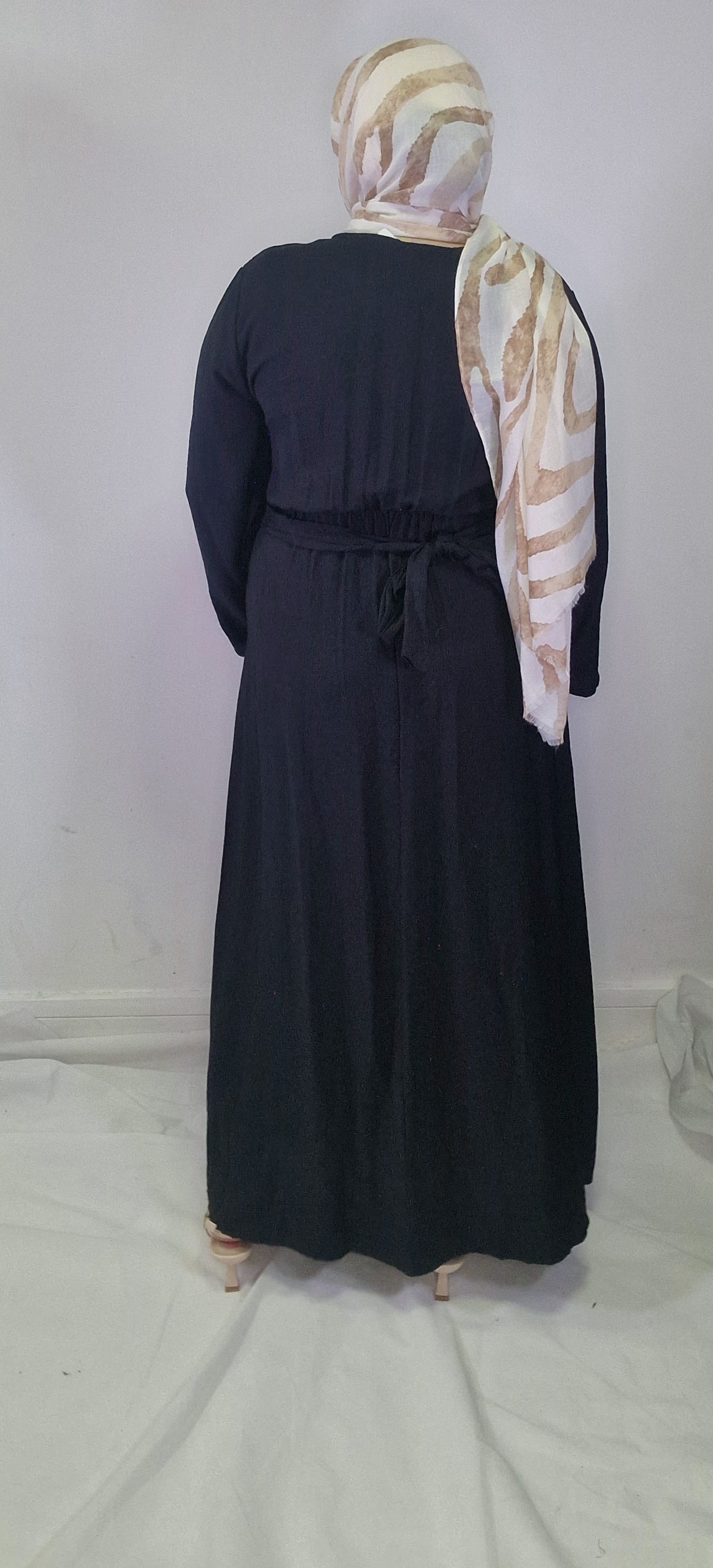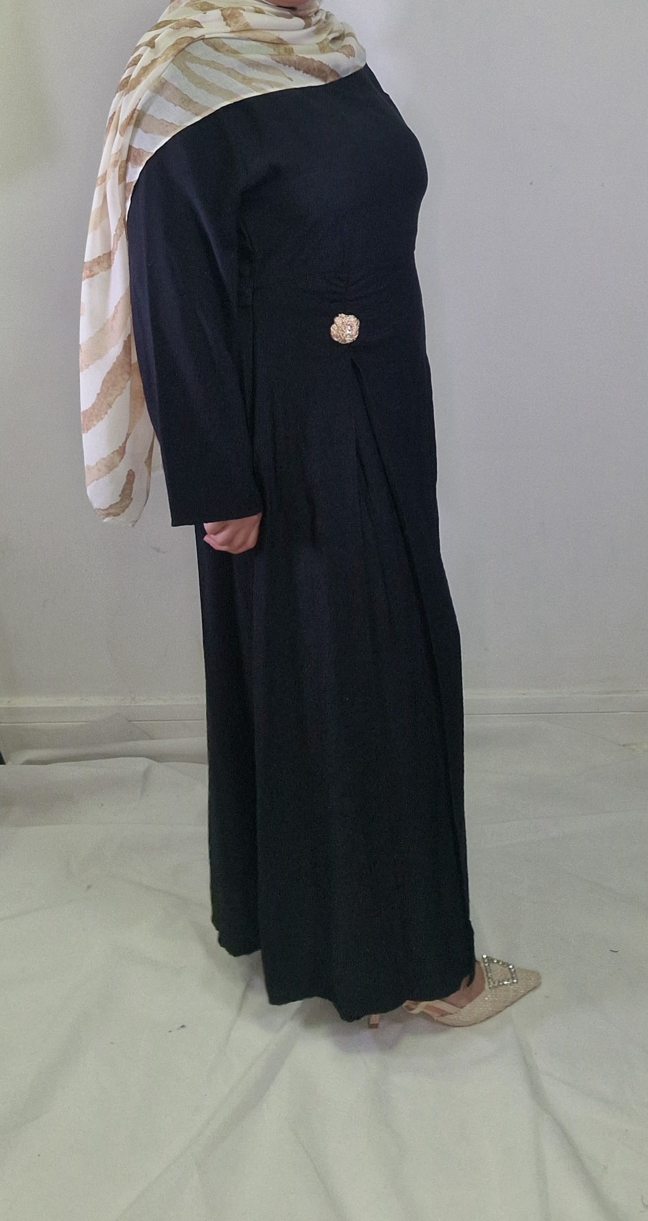 Introducing our Maha abaya, an elegant and chic must-have piece for any wardrobe. With its gold button detail on the waist and open slit, this abaya exudes sophistication and exclusivity. Elevate your modesty and fashion game with this beautiful piece.