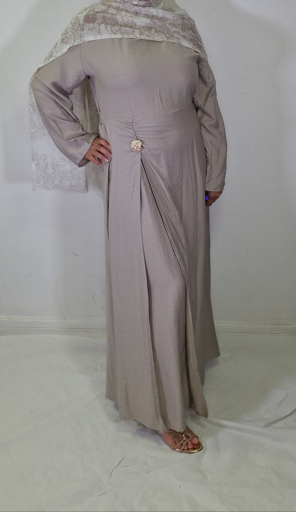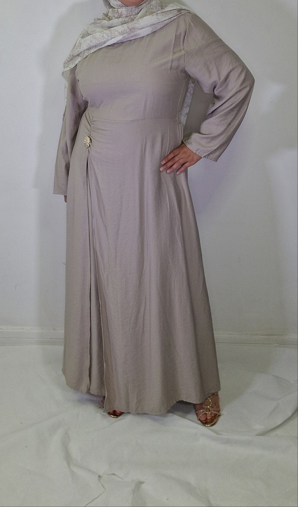 Introducing our Maha abaya, an elegant and chic must-have piece for any wardrobe. With its gold button detail on the waist and open slit, this abaya exudes sophistication and exclusivity. Elevate your modesty and fashion game with this beautiful piece.