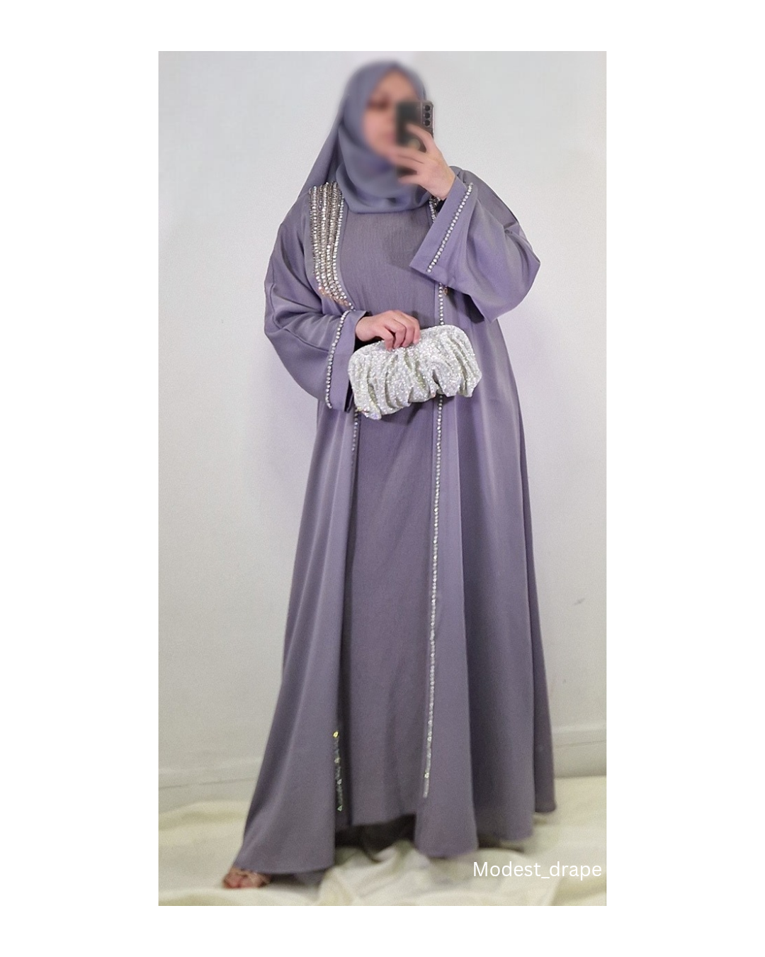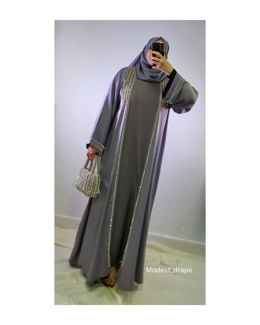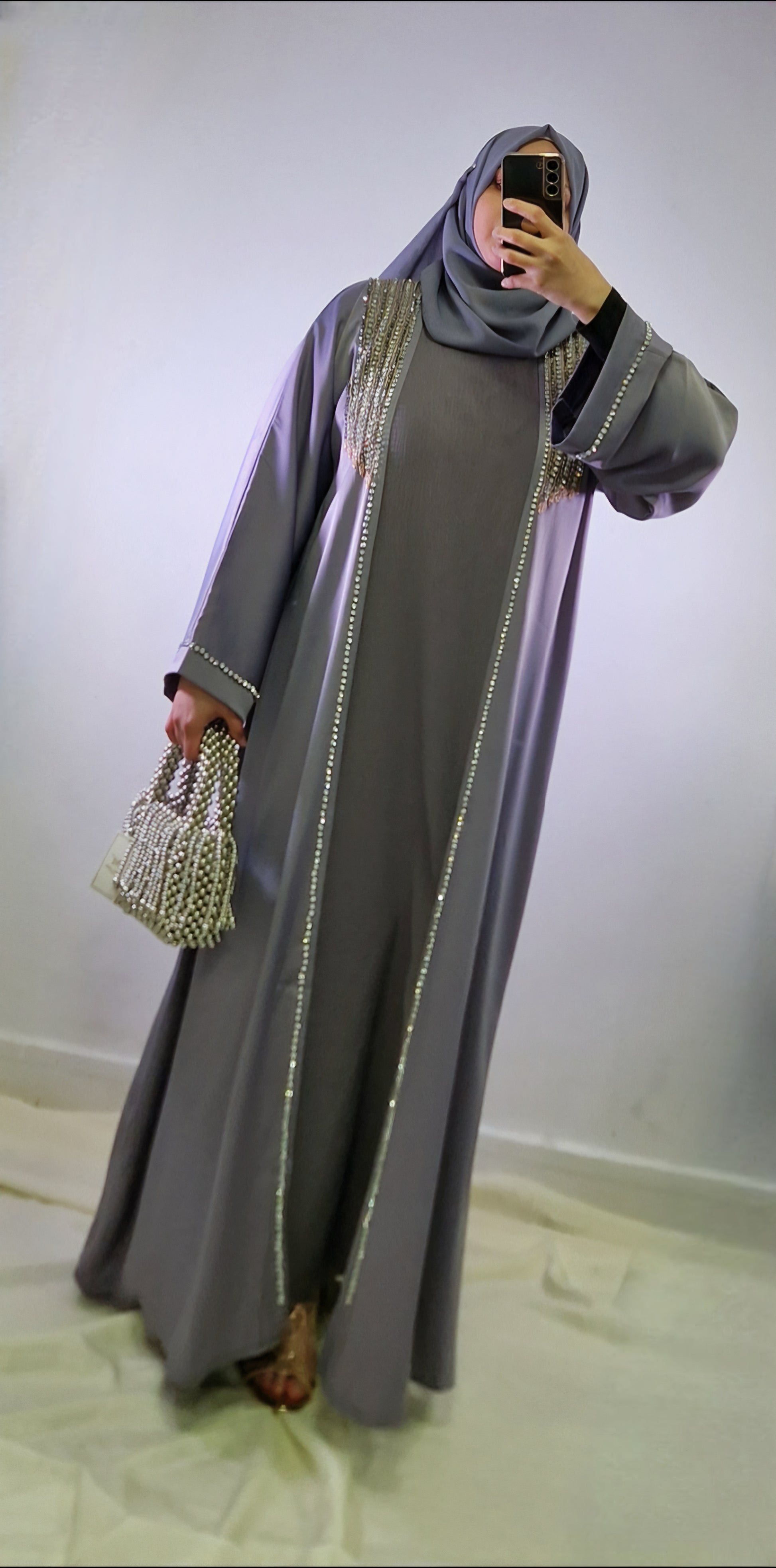 Gorgeous luxury feel satin abaya with hand work embedded beads giving you effortlessly elegant look.